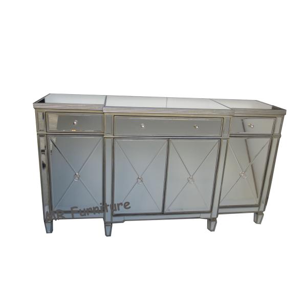 The mirrored side board feature is luxry, the behind door have a shelf for divid your storage. There are 3 drawers.